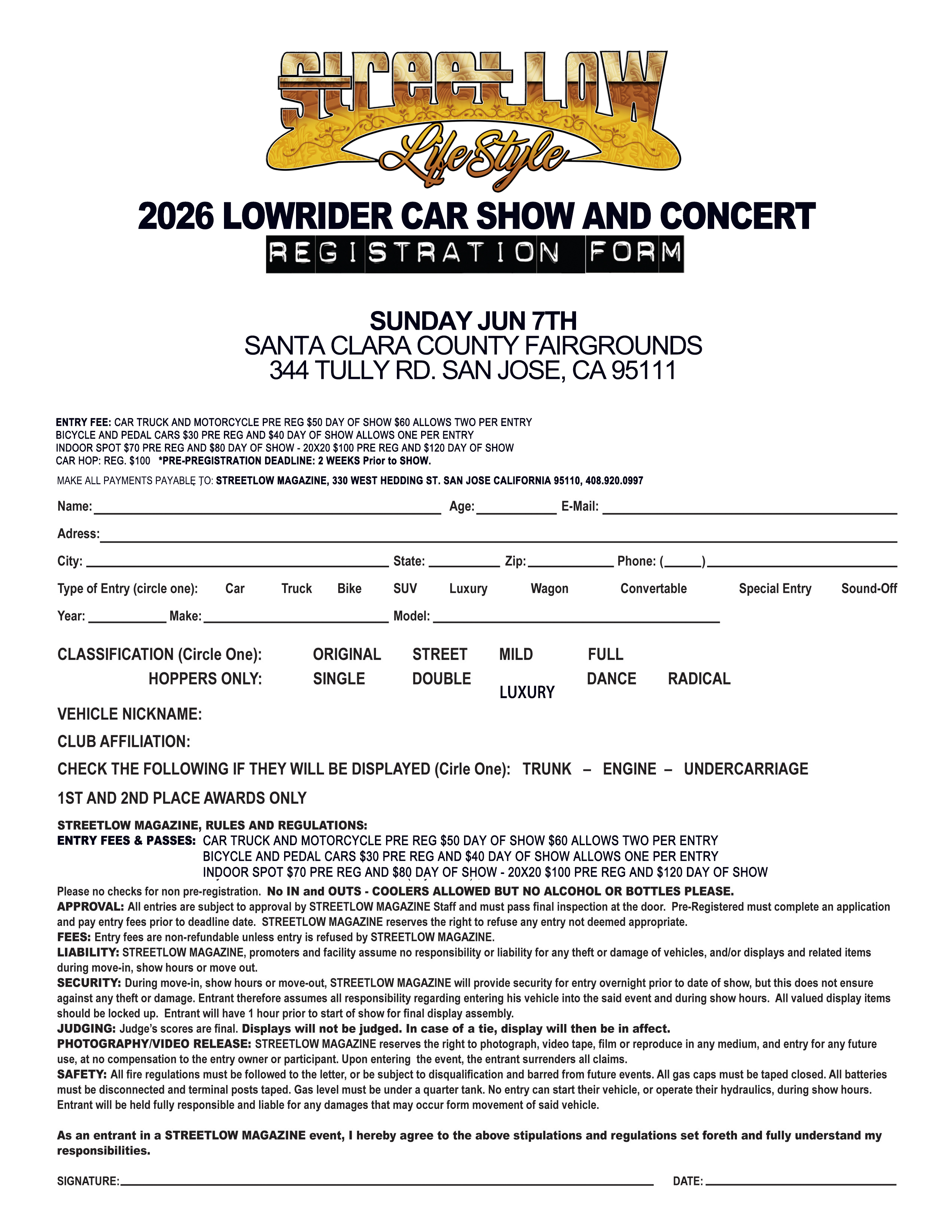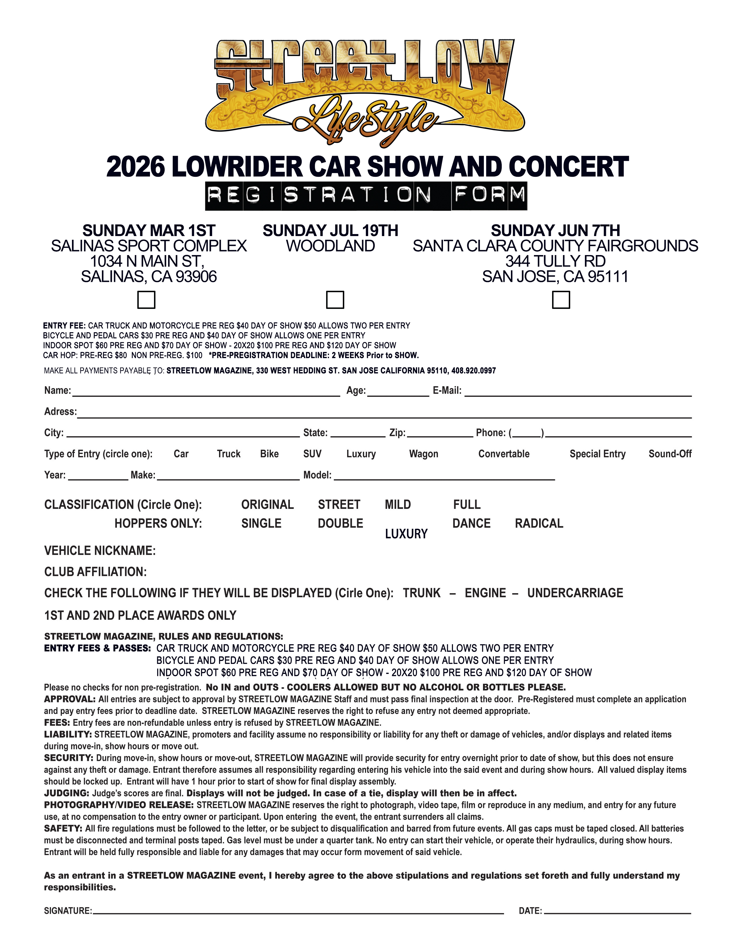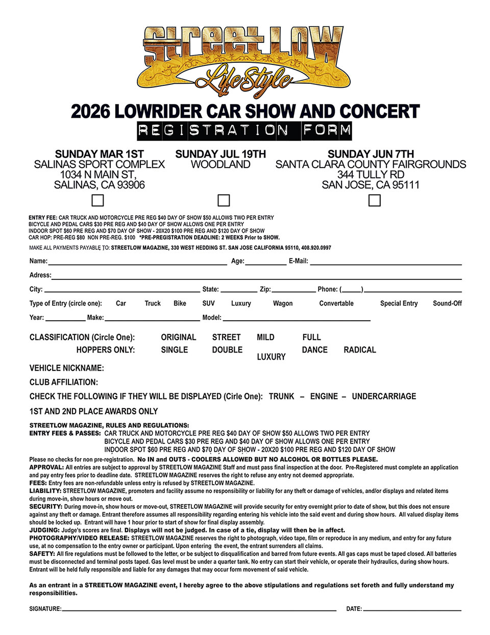 Print & fill out your registration form then mail your completed form, with payment to: Streetlow Magazine, 330 West Hedding St. San Jose CA 95110. For further info call (408) 920 0997.